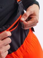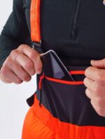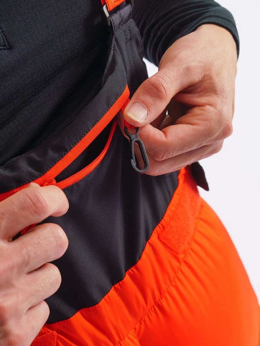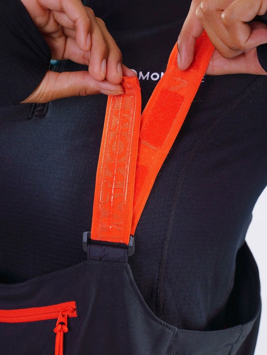 Напівкомбінезон оснащений високим еластичним нагрудником із передньою кишенею на блискавці та затискачем для електроніки. Фіксовані підтяжки з силіконовими накладками “липнуть” до одягу і не ковзають, відвертаючи увагу; їхню довжину можна регулювати.