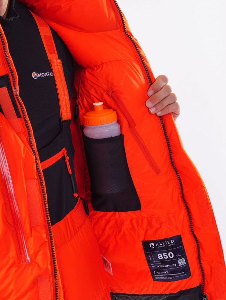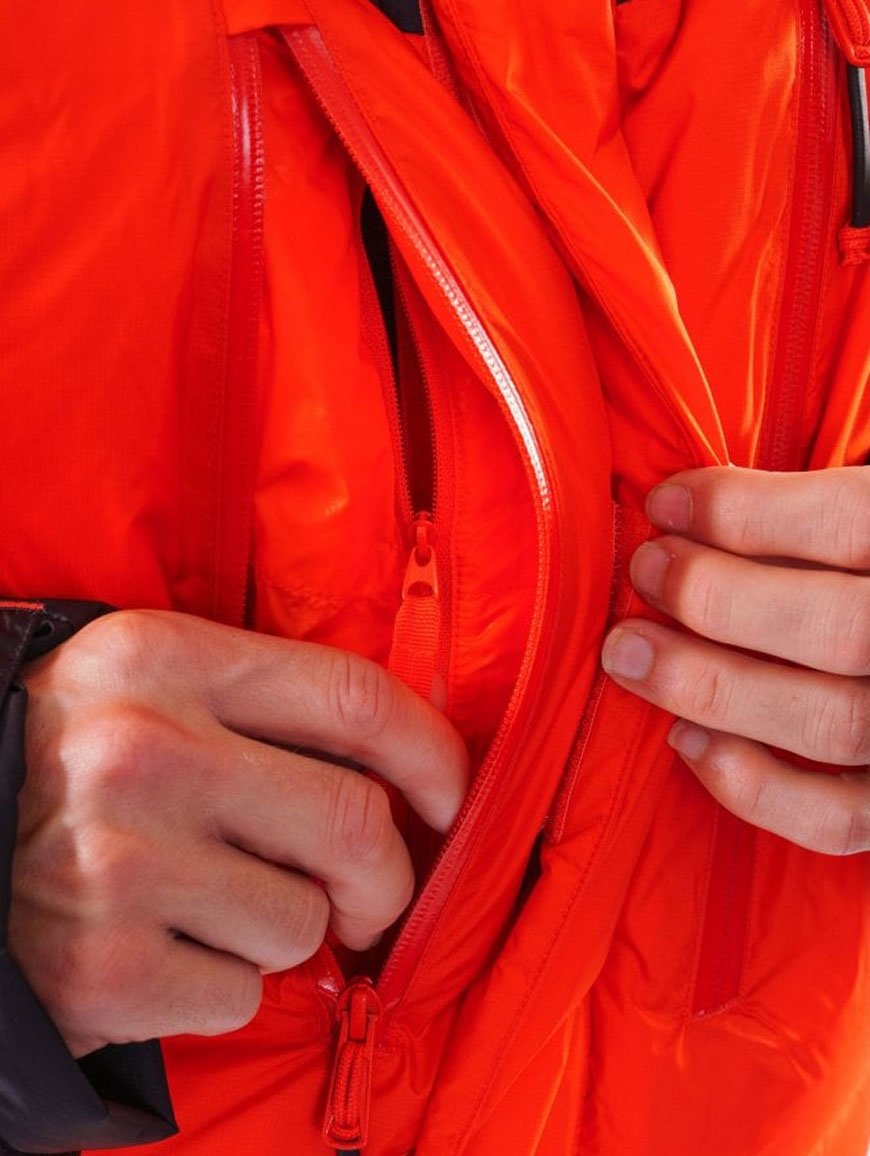 Повністю регульований глибокий утеплений капюшон сумісний з каскою для альпінізму. Високий комір не перешкоджає носінню кисневої маски. Внутрішній регулювальний шнур на талії максимально захищає від втрат тепла. Від зайвого тепла, навпаки, можна позбутися через вентиляційні отвори на блискавках, розташовані під пахвами. Куртка оснащена безліччю зовнішніх та внутрішніх кишень, у тому числі внутрішніми кишенями для води та гаджетів.